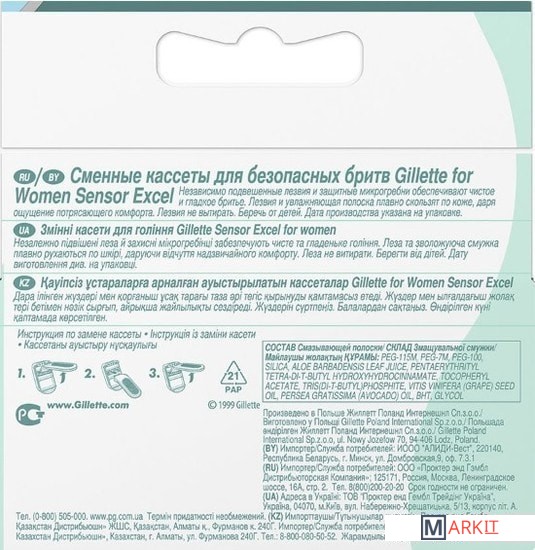 Сменная кассета "Gillette for Women Sensor Excel" с независимо подвешенными лезвиями и мягким, защитным микрогребнем делает процесс бритья безопаснее, обеспечивая большую чистоту и гладкость, чем вы могли бы себе представить. Лезвия Gillette Comfort созданы более тонкими, чтобы обеспечить скольжение без усилий для ощущения невероятного комфорта. Увлажняющая полоска выделяет растительные масла, алоэ, витамин Е и дополнительные увлажняющие компоненты.