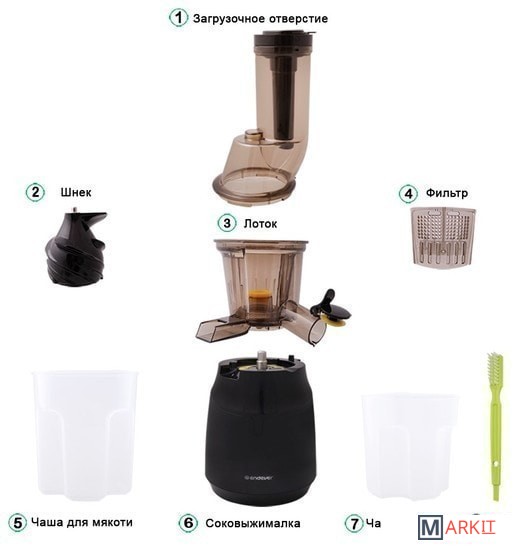 | Комплектация | СоковыжималкаТолкательЛотокШнекФильтрКрышка фильтраЧаша для мякотиЧаша для сокаЩеткаИнструкцияСписок сервисных центровГарантийный талон |