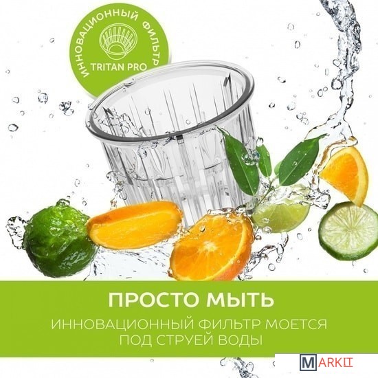 1) Долговечный фильтр из Тритана — можно мыть в посудомоечной машине;2) Компактный размер базы;3) Сок холодного отжима из овощей, фруктов и зелени.