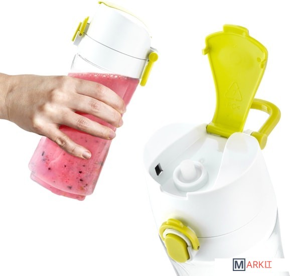 Блендер оснащён двумя бутылками ёмкостью 400 и 600 мл с мерной шкалой. Крышка бутылки оснащена удобной ручкой для переноски и носиком для питья.Отличительной особенностью данной модели является возможность откачки воздуха из бутылки после приготовления блюда или напитка – так готовый продукт сможет дольше сохранить свежесть, полезные свойства и аромат.Откачка воздуха производится через вакуумный шланг – он установлен в моторный блок устройства, а на его конце расположен вакуумный клапан, подсоединяемый к крышке к бутылке. После нажатия кнопки «Вакуум» начнётся откачка воздуха из бутылки.