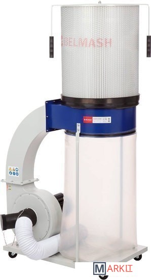Модель BELMASH DC2500МС, мощностью 1500 Вт, рассчитана на подключение к сети 400 В. Является аналогом модели DC2500. Основное преимущество - наличие фильтр-картриджа, улучшающего качество очистки.Конструкция представляет собой основание, на котором размещены корпус установки с асинхронным двигателем и стойки. Выходной патрубок установки соединен стальным отводом прямоугольного сечения с разделительным корпусом. На входной патрубок вытяжки (Ø125 мм) устанавливается адаптер с двумя входами (Ø100 мм), поэтому вытяжку можно подключить сразу к двум точкам удаления отходов резания. Если задействован только один вход, то второй закрывается крышкой. К стальным стойкам прикреплен разделительный корпус, на верхнюю часть которого установлен фильтр, а снизу закреплен стружкосборник.Вытяжку легко перемещать, на нижней части основания имеются четыре поворотных колеса. В комплект поставки входит 4-х секционный переходник.