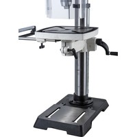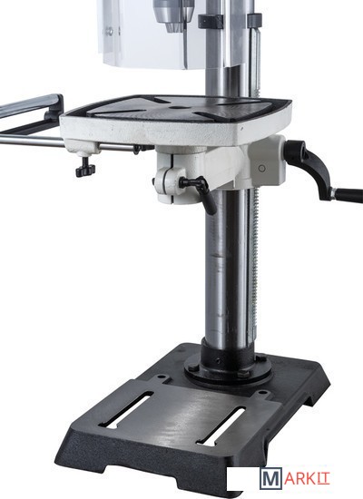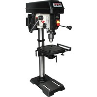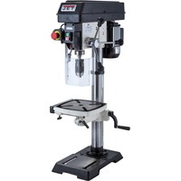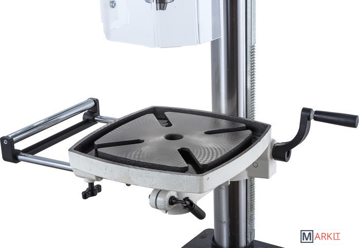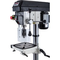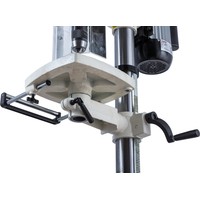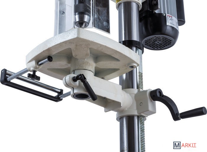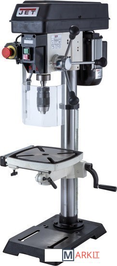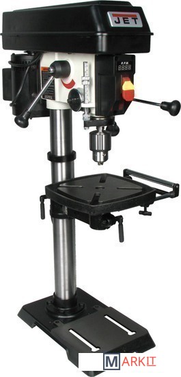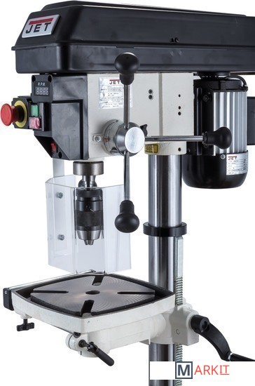 Цифровая индикация скорости вращения шпинделяРегулируемый ограничитель глубины сверленияКонтроль глубины сверления по лимбуМиллиметровая шкала для контроля глубины сверленияЛазерный указатель оси сверленияСветодиодный фонарь подсветкиПлавная регулировка скорости вращения шпинделя без переустановки ремня (вариатор)Цифровое отображение частоты вращенияРабочий стол из чугунного литьяВыдвижное расширение рабочего столаРегулировка высоты установки рабочего стола при помощи вращающейся рукояткиРегулировка наклона рабочего столаБыстрозажимной сверлильный патронПоворотный рабочий столЧетыре Т-образных паза в столеJWDP-12 — настольный сверлильный станок профессионального класса, подходящий для универсального (дерево и металл) применения. Основная отличительная черта этой модели – клиноременный вариатор, позволяющий плавно бесступенчато изменять скорость вращения шпинделя. Такая конструкция механизма ускоряет настройку в зависимости от диаметра сверления: вместо снятия и последующей установки ремня достаточно перевести рычаг, причем делают это, не выключая мотор. При этом фактическая скорость вращения шпинделя будет отображаться на цифровом дисплее, что особенно важно при работе с металлом, когда ограничения по частоте вращения режущего инструмента гораздо более строгие, чем при работе с деревом.Станок оборудован массивным чугунным столом, имеющим Т-образные пазы для крепления тисков. Стол установлен на литом кронштейне, поворачивается вокруг своей оси и наклоняется влево и вправо на угол до 45 градусов. Кронштейн перемещается вверх и вниз по колонне благодаря зубчато-реечному механизму с вращающейся рукояткой. Рабочая поверхность для установки тисков отфрезерована и на основании, что позволяет работать от него, предварительно сняв или отвернув в сторону стол.Подача пиноли производится стандартным штурвалом с тремя рукоятками, на его оси лимб для контроля глубины сверления. Кроме того. есть винтовой ограничитель с собственной миллиметровой шкалой, облегчающей настройку положения гайки-стопора. Вес подвижной части (шпиндель, быстрозажимной патрон, режущий инструмент) частично компенсируется спиральной пружиной, у которой можно менять предварительный натяг.Предусмотрен светодиодный фонарик с выключателем для подсветки рабочей области и лазерный указатель оси сверления.