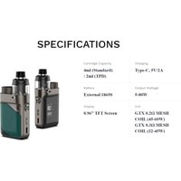Комплектация - батарейный мод- картридж 2 мл- сеточный испаритель 0.2 Ом (предустановлен)- сеточный испаритель 0.3 Ом- кабель для зарядки (USB Type-C)- дриптип- документация