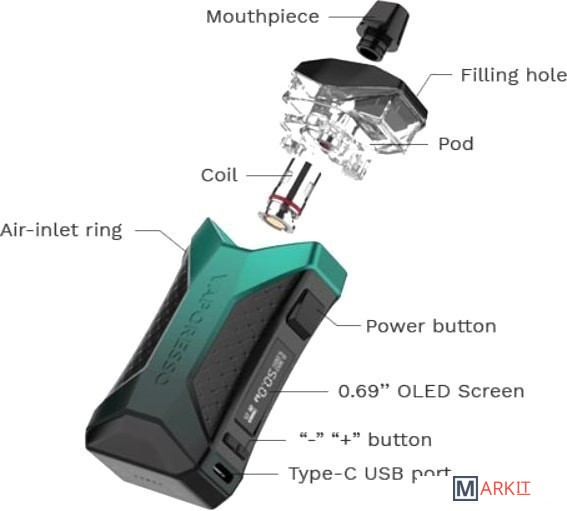 Комплектация - кабель для зарядки (USB Type-C)- картридж 5.5 мл- испаритель 0.3 Ом- испаритель 0.8 Ом- сменный дрип-тип- документация