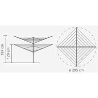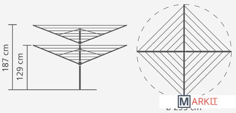 Навеска – 60 метров, максимальная нагрузка – 40 кг.Простой и удобный регулируемый «зонтичный» механизм сложения.Бесступенчатая регулировка на нужную высоту (129-187 см).Нет необходимости обходить сушилку – направляющие плавно поворачиваются.Всегда туго натянутые веревки – регулировка натяжения в трех положениях.Нижнее положение идеально подходит для сушки подушек.Бельевые веревки устойчивы к действию УФ и имеют нескользящий профиль.При необходимости удобная замена каждой веревки по отдельности.На всех направляющих предусмотрены специальные отверстия для плечиков.Удобна в хранении – прочная петелька для подвешивания.В комплекте: чехол, металлическое основание для установки сушилки (ø 45).Металлическое основание позволяет устанавливать сушилку без бетона.Отдельно предлагается пластиковое основание для установки в бетон.