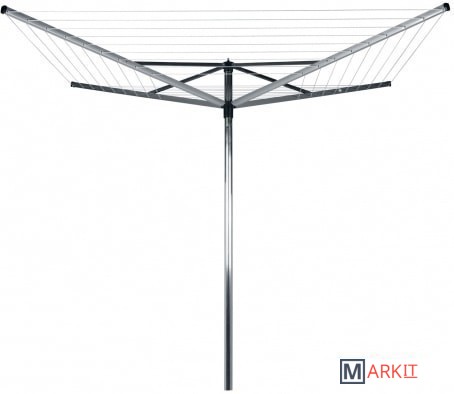 Навеска – 50 метров, максимальная нагрузка – 40 кг.Простой и удобный регулируемый «зонтичный» механизм сложения.Нет необходимости обходить сушилку – направляющие плавно поворачиваются.Всегда туго натянутые веревки – регулировка натяжения в трех положениях.Бельевые веревки устойчивы к действию УФ и имеют нескользящий профиль.При необходимости удобная замена каждой веревки по отдельности.На всех направляющих предусмотрены специальные отверстия для плечиков.Удобна в хранении – прочная петелька для подвешивания.В комплекте: металлическое основание для установки сушилки (ø 45).Металлическое основание позволяет устанавливать сушилку без бетона.Отдельно предлагается пластиковое основание для установки в бетон.