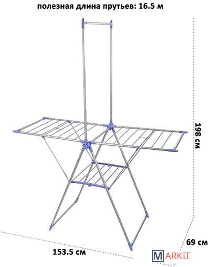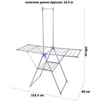 Сушилка напольная 153,5х69х198 с перекладиной для вешалок позволит компактно сушить большое количество одежды. Сушилка выполнена из пластика и металла. Полезная длина для развешивания 16,5 метров. Выдерживает до 15 кг при равномерном распределении. Имеет 19 перекладин на верхней части и 6 перекладин на нижней. Размер сушилки со сложенной перекладиной 153,5х69х98 см, размер полностью сложенной сушилки 107х69х8 см. Такая сушилка сможет стать удобным дополнением вашего дома!
