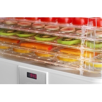 Сушка фруктов, овощей, грибов, зелени, цветов и макаронных изделийКоличество экранов: 5 прозрачных экранов + крышкаЦифровое управлениеУстановка расстояния между ситамиПрограмма по умолчанию: 70 ° C / 10 ч.Равномерная сушкаТАЙМЕР: 30 мин. - 99 ч (каждые 30 мин.)Площадь экрана: 0,3 м2Защита от перегреваТихая работа: макс. 60 дБ