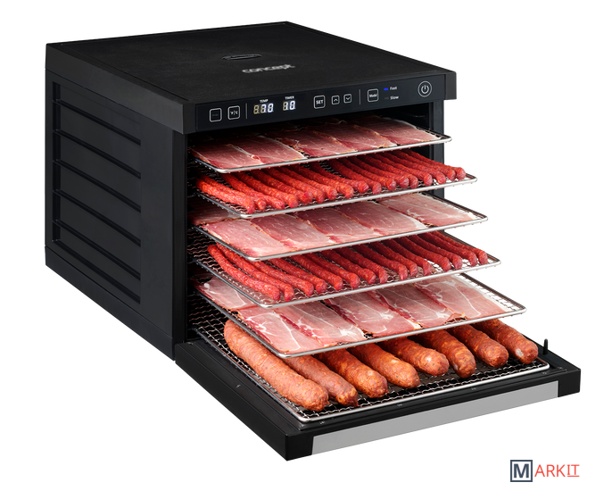 Два вентилятора для равномерного сушкиЦифровой таймер 1 - 99 часовСветодиодный дисплейРазмер стола: 34 x 38,5 см.Защита от перегреваНапряжение: 220 - 240 В