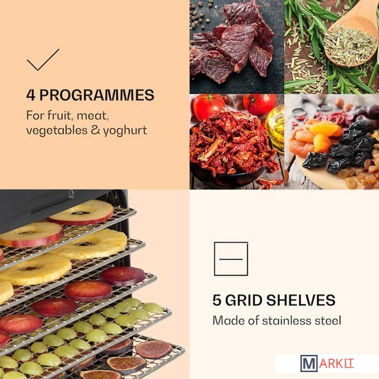 Klarstein Флорида солонина Дегидратор сушит фрукты, овощи, мясо и другие пищевые продукты с использованием инфракрасной технологии при скорости записи, что позволяет производство натуральных фруктов и ингредиентов.Благодаря тепловой мощности 500 Вт с инфракрасной технологией и равномерным распределением тепла, Флорида Jerky сушки машина гарантирует , что плоды высушенные таким же образом , как и в солнце, и само время сушки коротко. Важные минералы и витамины сохраняются во время сушки, а вкус становится более интенсивным. Благодаря полностью автоматическому процессу сушки с четырьмя выбираемыми программами фрукты, мясо, овощи или даже йогурт готовятся легко и без усилий. В дополнительном ручном режиме можно установить температуру от 35 до 75°С и время от 1 до 99 часов.Очистить сушильную машину после окончания процесса очень просто: внутреннюю часть корпуса и сетчатые полки можно без проблем промыть. Корпус изготовлен из прочного пластика и легко моется снаружи.Размеры одной полки: примерно 30 x 24 см (Ш x Г)Длина шнура питания: около 120 см.С воздушным фильтромЖК дисплейЭлектропитание: 220-240 В ~ | 50/60 Гц