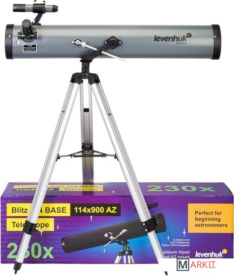 Levenhuk Blitz 114 BASE – рефлектор Ньютона со 114-миллиметровым сферическим зеркалом и богатой комплектацией. Это хороший вариант первого телескопа для начинающего астронома, который хочет наблюдать не только ближний, но и дальний космос. В телескоп можно ясно увидеть Луну, планеты Солнечной системы вплоть до Сатурна, шаровые скопления, диффузные и планетарные туманности, ярчайшие объекты из каталога NGC.