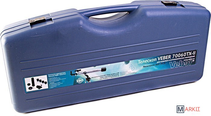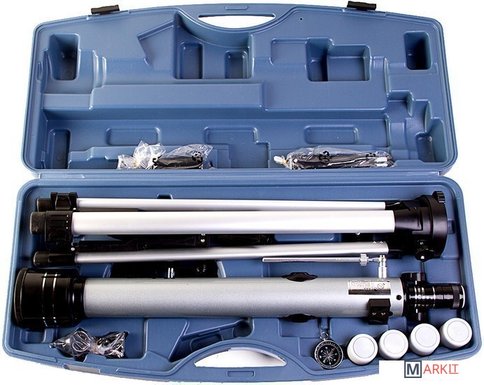 Походный вариант телескопа с очень богатой комплектацией. В жесткий противоударный кейс размером 750 мм на 340 мм (и крышка и дно кейса сделаны из двух слоев пластика, разделенного воздушным промежутком), уместился сам телескоп, штатив с полочкой, четыре окуляра, компас, фокусер... Его можно брать с собой для вылазок на природу и использовать как мощную зрительную трубу днем, а как телескоп - в темное время суток. Минимальное увеличение - 35х, максимальное - 262х.