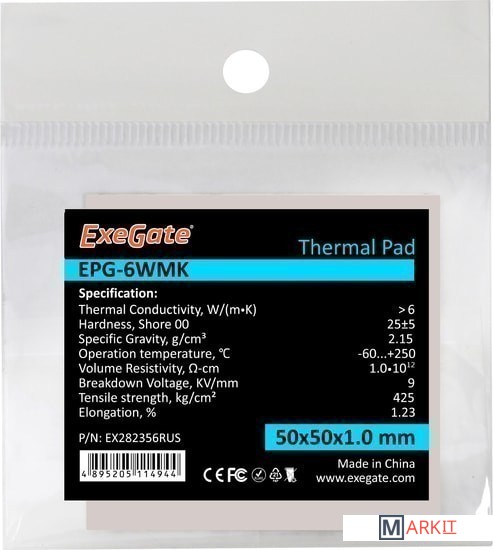 Markit » Системы охлаждения » Термопрокладка ExeGate EPG-6WMK EX282356RUS (50x50x1.0 мм)
