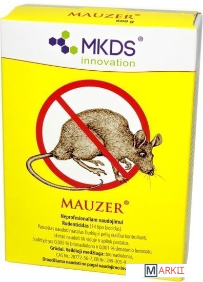 Mauzer (Маузер) представляет собой готовую к использованию ядовитую приманку для борьбы с грызунами - мышами и крысами. Средство предназначено для непрофессионального использования внутри и вокруг зданий.Использование:Приманку следует распределить в местах наибольшей активности грызунов. Не рекомендуется класть зерно в одном месте - для наилучшего эффекта необходимо охватить всю территорию распространения грызунов. Приманка обладает привлекательным для крыс и мышей ароматом. Грызуны, съевшие приманку, погибают через 4-6 дней от внутреннего кровотечения.Ежедневно следует осматривать контролируемый участок и собирать павших грызунов для утилизации. В случае, если приманка съедена, необходимо увеличить ее количество и расширить площадь применения.Для безопасности домашних животных и птицы ядовитую приманку нужно размещать в недоступных для них местах. Приманка должна быть защищена от влаги. После 35 суток использования, в большинстве случаев, грызуны будут уничтожены. Если этого не произошло, следует обратиться к специалистам для выяснения причин и принятия мер.