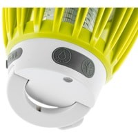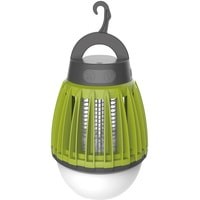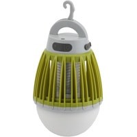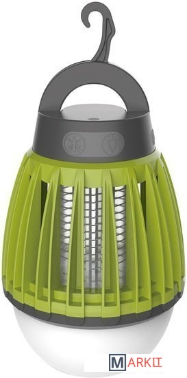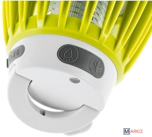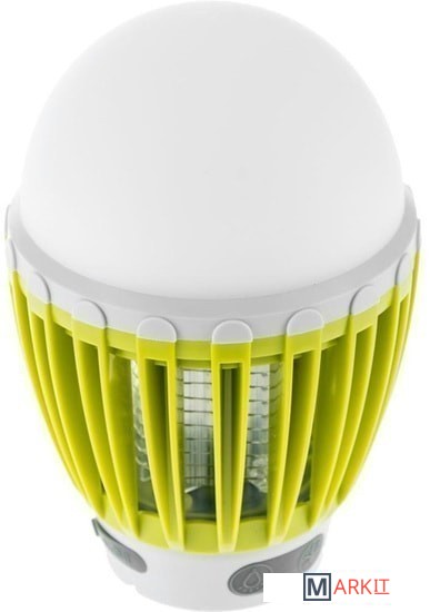 Оснащена двумя типами светодиодов - ультрафиолетовыми и стандартными белыми. Первые не оказывают воздействия на насекомых и выполняют функцию уличной подсветки (яркость светового потока 100 Лм). Вторые привлекают своим светом летающих насекомых. Комары и мошки подлетают к решётке лампы, соприкасаются с ней - и получают удар током.Важно, что электрический разряд в данном устройстве минимален и абсолютно безопасен для человека. Его хватает только на обездвиживание мелких насекомых. Данная лампа имеет встроенный литиевый аккумулятор ёмкостью 2000 мАч и подзаряжается от USB (провод в комплекте). Она хорошо защищена от попадания пыли внутрь корпуса (международный класс защиты оболочки IP60).Имеет форму традиционной электрической лампочки и оснащена крючком для подвешивания.