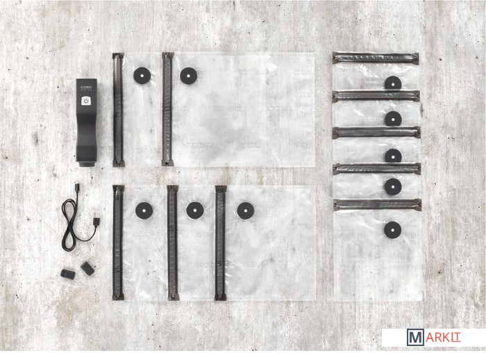 Ручной вакуумный упаковщик CASO Vacu OneTouch Eco-Set без камеры быстро откачивает воздух из пакетов и контейнеров. Используйте для заготовки и упаковки продуктов на месте, даже если рядом нет розетки. Сохраняйте продукты в вакууме сразу после разделки. В отличие от полностью ручных устройств CASO Vacu OneTouch работает на встроенном Li-ion аккумуляторе, и откачивает воздух с давлением до 0,4 бара и достигает производительности 3 л/мин.Компактный, ручной вакуумный упаковщик c пакетами в комплектеХранение продуктов в вакууме — просто, быстро и вездеПроизводительность насоса: 3 л/мин при давлении -0,4 барУправление одной рукойДолговечный литий-ионный аккумулятор для работы до 150 минут — вакууматор работает даже во время зарядкиУдобный светодиодный индикатор — белый, когда аккумулятор заряжен, и красный, когда аккумулятор разряженАвтоматическая остановка при достижении вакуумаАвтоматическая остановка через 2 минуты при случайном включении прибораЛегкая очистка благодаря съемному уплотнителюВ комплекте 10 ZIP-пакетов (5 штук 20×23 см, 3 штуки 26×23 см, 2 штуки 26×35 см), 2 ZIP Lockers и кабель для зарядки USB-C