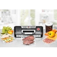 Удобная ручка;Встроенный отсек для рулона;Автоматический и ручной режим;Импульсный режим;Индикатор статуса работы;Место хранения кабеля;Нескользящие прорезиненные ножки;В комплекте: 5 пакетов 20х23 см, 5 пакетов 30х40 см, 1 рулон 30х600 см, переходник для контейнеров, резак.