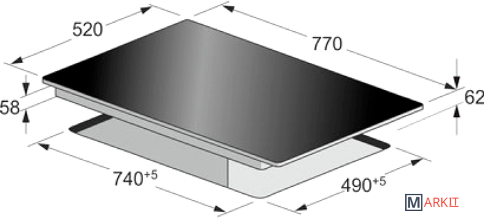 2 объединённых двойных поля: 200 × 400 мм, 3,5 кВт, режим POWER – 4,3 кВт в которые входят ▪ 2 нагревательных поля: 180 мм, 2 кВт, режим POWER – 2,3 кВт. 180 мм, 1,5 кВт, режим POWER – 2 кВт ▪ 1 нагревательное поле: 210 мм, 2 кВт, режим POWER – 2,3 кВт.
