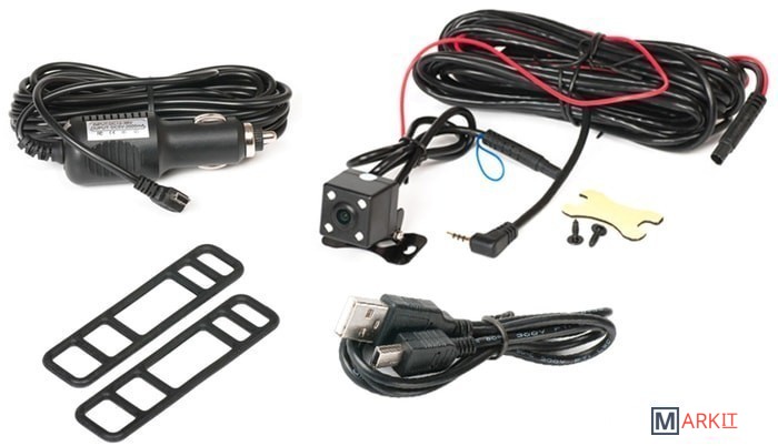 Комплектация - Крепежные элементы- Выносная камера (Камера заднего вида)- Кабель камеры заднего вида- Кабель питания длиной 3м, с адаптером питания- USB кабель- Инструкция по эксплуатации