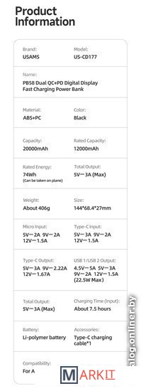 Markit » Портативные зарядные устройства » Внешний аккумулятор Usams US-CD177 PB58 20000mAh (черный)