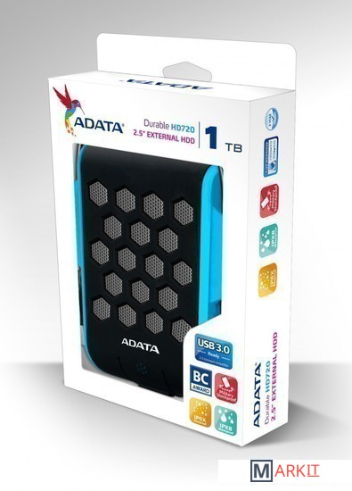 Водо- и пылезащищенный/ударопрочный внешний жесткий диск HD720. Благодаря защищенной конструкции, HD720 нормально работает даже в запыленной среде и после погружения в «состоянии консервации» на 120 минут в воду на глубину 2 метра.