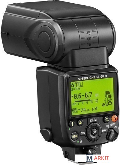 головка вспышки наклоняется в диапазоне от 7 градусов вниз до 90 градусов вверх и поворачивается в горизонтальной плоскости на 180 градусов влево и вправо