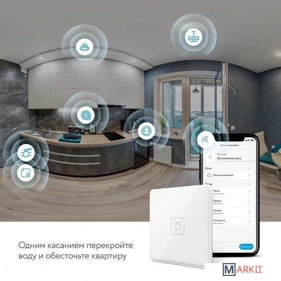 Панель дистанционного управления — беспроводное устройство, которое позволит расширить возможности Умного дома, не привязываясь к штатной проводке.Больше, чем выключательС помощью Панели управления вы можете не только управлять светом, но и ставить дом на охрану, открывать дверь при звонке в домофон, выключать все приборы в доме, а также запускать сценарии.Не требует подключения к электросетиПанель управления работает от батарейки. Когда она будет разряжена, на ваш смартфон придет push-уведомление.Простая настройка и подключениеДобавление и настройка Панели занимает меньше 5 минут — просто запустите приложение Rubetek и следуйте инструкции. Панель сама подключится к системе Умный дом.Управляйте освещением из разных точек вашего домаОткажитесь от обычных проходных выключателей — Панель управления проще в установке, не требует прокладки проводов и штробления стен.Там, где удобно вамБлагодаря простой системе крепления Панель управления легко устанавливается в любом удобном для вас месте.СценарииС розеткой RЕ-3305: включите электроприбор в сеть с помощью розетки и управляйте его работой, используя Панель.С блоком управления RЕ-3315 и RЕ-3313: подключите несколько блоков к источникам освещения в разных комнатах и управляйте ими с помощью одной Панели.Выключить весь свет: подключите осветительные приборы во всех комнатах к блокам управления, разместите Панель у входной двери и выключайте свет во всем доме перед уходом.Постановка дома на охрану: разместите Панель у входной двери и включайте режим “Охрана” перед уходом одним касанием.Габариты 80×80×12 ммВес 100 г