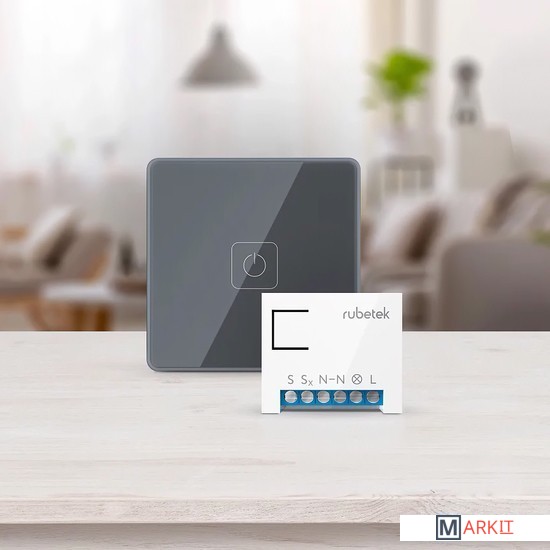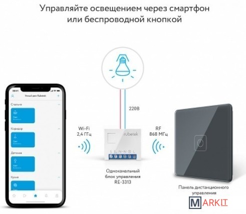 Беспроводной Wi-Fi выключатель позволяет удаленно управлять светом и любыми электроприборами мощностью до 3 кВт с телефона или с помощью панели управления, входящей в комплект.Устройства новой линейки IoT.pro работают на обновленной частоте RF 868 МГц, которая обеспечивает отличную надежность и высокий уровень сигнала на расстояниях до 200 метров.Управляйте светом, ставьте дом на охрану, открывайте дверь при звонке в домофон, выключайте все приборы в доме, а также запускайте сценарии одним касанием.Управляйте умными устройствами Rubetek с помощью голосовых помощников Алиса, Маруся, Google Assistant или Siri.Вы можете создавать разнообразные сценарии работы вашего окружения: включать и выключать свет по расписанию, управлять электроприборами на основе показаний датчиков, получать push-уведомления в случае срабатывания сценария или устройства.Если стационарный выключатель расположен в труднодоступном месте — подключите источник освещения к блоку управления, а панель управления расположите в удобном месте и управляйте светом с помощью панели или смартфона.Подключите несколько блоков к источникам освещения в разных комнатах и управляйте ими с помощью одной Панели.Выключить весь свет: подключите осветительные приборы во всех комнатах к блокам управления, разместите Панель у входной двери и выключайте свет во всем доме перед уходом.Блок управления, входящий в комплект, выступает в роли управляющего устройства и позволяет подключать к системе Умный дом до 64 устройств: датчиков, панелей дистанционного управления и других устройств, работающих на частоте RF 868 МГц.Блок управления оснащён функцией мониторинга электроэнергии — с помощью бесплатного приложения Rubetek вы всегда сможете ознакомиться со статистикой энергозатрат.Габариты Блок управления 42,5×36×17 мм