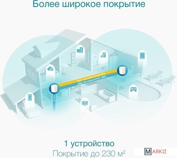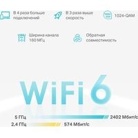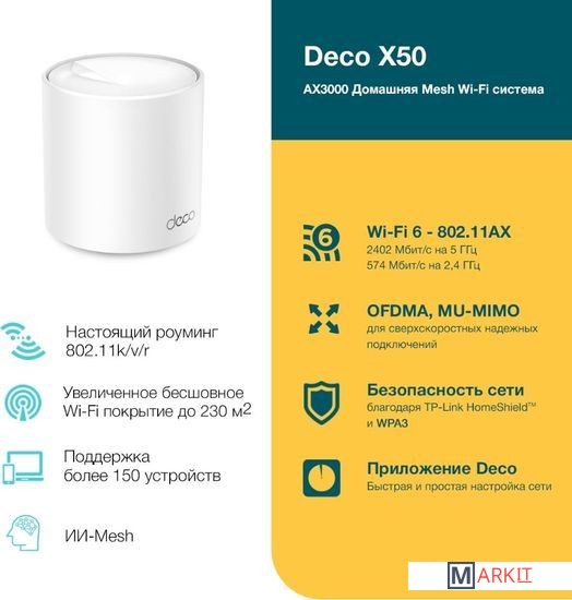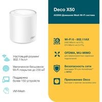 Использование Wi-Fi 6 в Mesh-системе позволяет получить прирост к площади покрытия, скорости и числу возможных подключений.Повышенная мощность сигнала, обеспечиваемая технологиями BSS Color и Beamforming, значительно увеличивает зону покрытия Deco X50. Беспроводное подключение и опциональное транзитное подключение Ethernet между модулями увеличит скорость сети и образует по‑настоящему бесшовное покрытие. Нужно увеличить площадь покрытия? Просто добавьте ещё один модуль Deco.Умный Mesh — постоянная адаптация и оптимизацияMesh-сеть Deco X50 работает под управлением искусственного интеллекта, который автоматически приспосабливается к домашней сети, учитывает качество подключения клиентов и поведение пользователей. Сложные алгоритмы учитывают разные факторы, благодаря чему Deco X50 создаёт идеальный Mesh Wi-Fi, уникальный для каждого дома — перемещайтесь по дому и наслаждайтесь бесшовным подключением на максимальной возможной скорости.Бесшовный роуминг с одним именем Wi-FiУстройства Deco формируют единую Wi-Fi сеть, поэтому смартфоны и планшеты будут автоматически подключаться к Deco на максимальной скорости в любой точке дома, обеспечивая непрерывное соединение.Предоставьте защиту домашней сети профессионаламОбеспечьте дополнительную безопасность домашней сети с помощью встроенной системы безопасности TP‑Link HomeShield, в которой есть всё необходимое для полного контроля над сетью: выявление уязвимостей в сети, ограничение проводимого в сети времени и блокировка сайтов.Быстрая настройка через приложение DecoПросто распакуйте Deco, установите приложение и следуйте инструкциям на экране. Deco сам настроит подключение и подготовит сеть к работе всего за несколько минут.Украсьте свой домБлагодаря простому утончённому дизайну белоснежный Deco X50 отлично впишется в любой домашний интерьер.