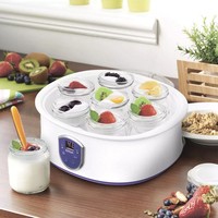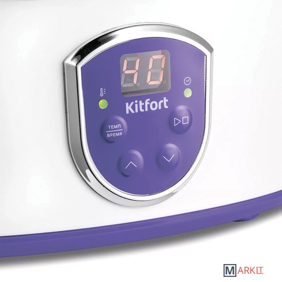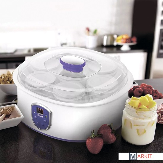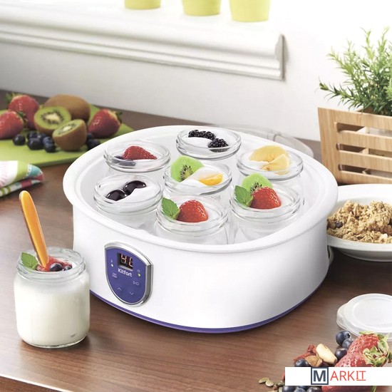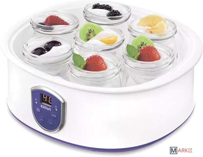 Домашний и полезный йогурт у вас домаЙогуртница Kitfort КТ-2088 с электронным управлением предназначена для приготовления вкусного и полезного домашнего йогурта. Йогуртница равномерно нагревает баночки с ингредиентами, поддерживая заданную температуру.Регулировка времени и температуры приготовленияЙогуртница имеет панель управления для установки времени и температуры приготовления и светодиодный дисплей для отображения настроек. Об окончании приготовления йогурта вас известит звуковой сигнал.Стильный дизайн впишется в любой интерьерПрибор имеет приятный дизайн. Несмотря на хорошую вместимость, йогуртница имеет небольшие габариты, что позволяет ей удачно вписаться в интерьер любой кухни, не заняв при этом много пространства. Корпус изготовлен из пластика.Дай волю фантазии!Приготовление домашнего йогурта очень увлекательный процесс, который позволит дать волю фантазии в выборе наполнителей на любой вкус! Однозначно понравится взрослым, детям и тем, кто следит за своей фигурой!Польза и безопасностьВ комплекте идут 7 стеклянных баночек по 180 мл, в которых готовый йогурт можно хранить в холодильнике. Стеклянные баночки сохраняют натуральные свойства домашнего йогурта, а также являются экологически чистым материалом.