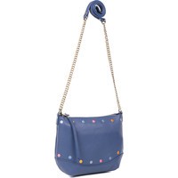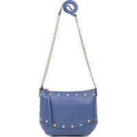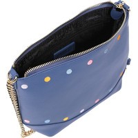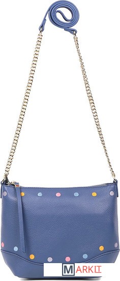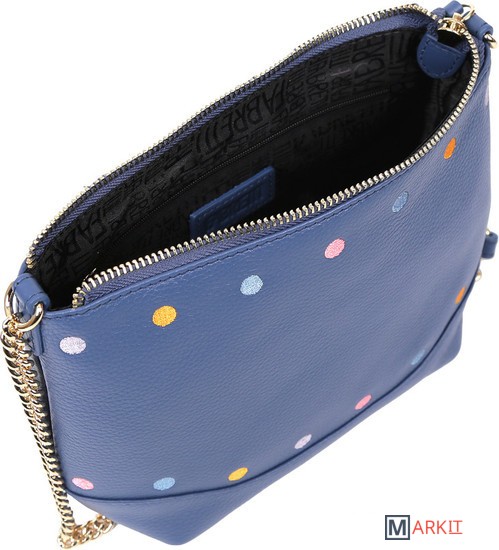 Каждая, даже самая строгая женщина, может проснуться однажды утром и понять, что сегодня у нее просто игривое настроение, когда хочется забыть обо всем, и просто быть естественной. Для такого настроения дизайнеры итальянскогг бренда FABRETTI создали эту модель сумки кросс-боди. Ее отличают разноцветные горошины, выполненные в технике вышивания. Такая сумка смотрится очень легко и непринужденно в сочетании с длинной ручкой в виде цепочки. Благодаря всем перечисленным особенностям эта модель будет прекрасно сочетаться и с брючным вариантом, и с юбкой различной длины, и в ежедневном образе, и с нарядом для свидания. Глубокий синий цвет подойдет практически к любым цветовым комбинациям в одежде, выигрышно их подчеркнув. Сумка имеет карман на тыльной стороне, закрывающийся на молнию и украшенный кожаной кисточкой. Чуть ниже замка расположено украшение в виде названия бренда. Особенностью этой сумки является то, что обе ее стороны могут выступать как лицевые. Модель имеет одно внутренне отделение на молнии и два