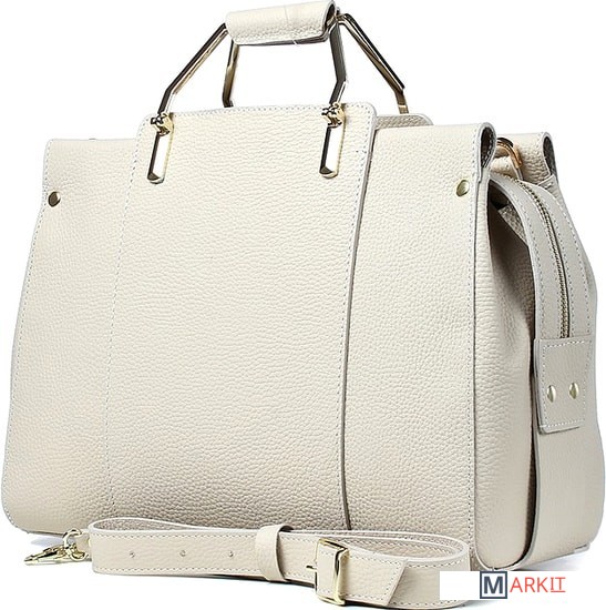 Элегантная модель из плотной натуральной кожи. Декорирована изысканной золотистой фурнитурой, фигурные металлические ручки с обтяжкой из кожи, заклёпки, металлическая молния. В комплекте имеется регулируемый плечевой ремень.